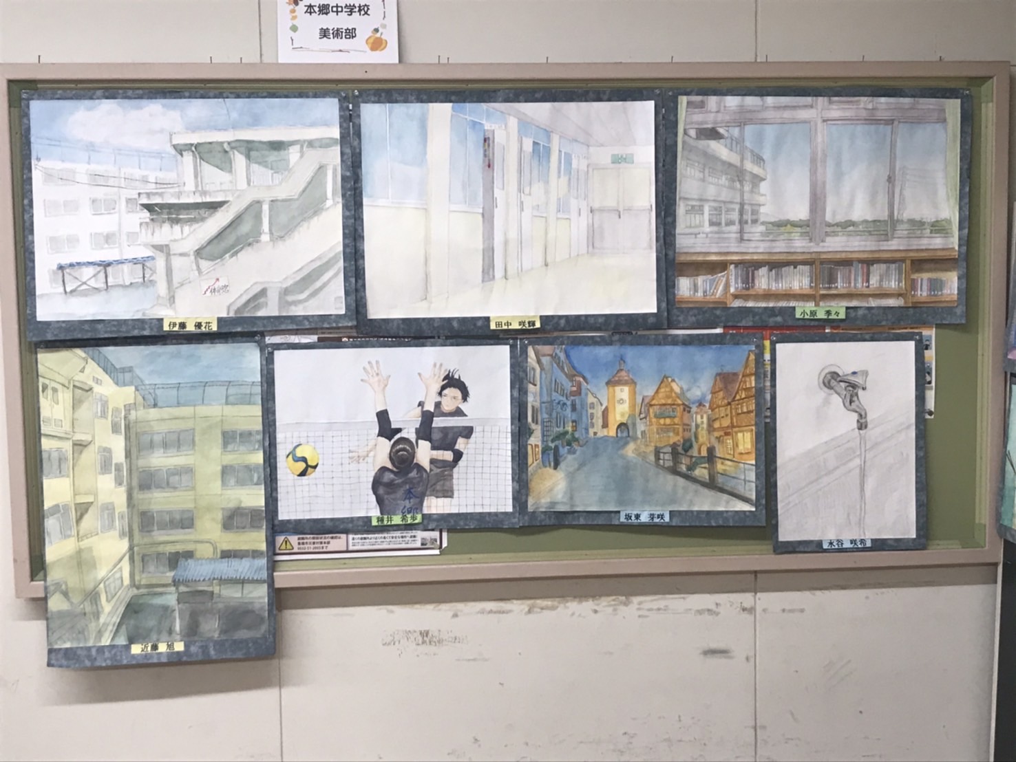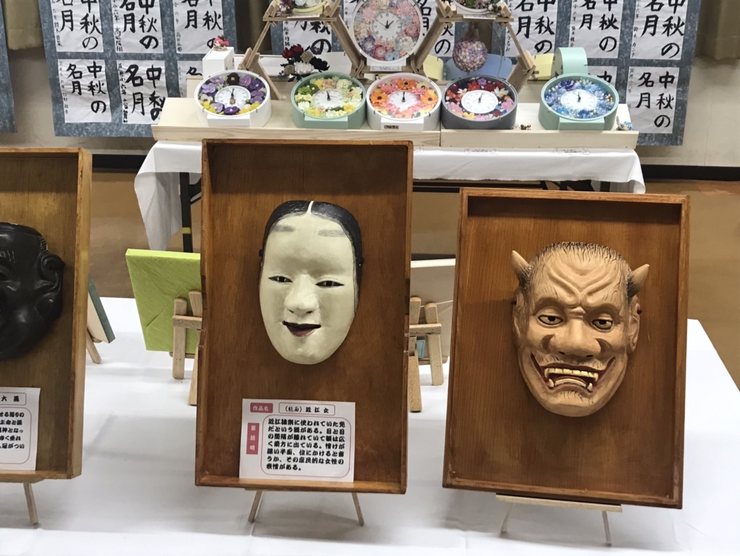 入り口付近の見事なお面に圧倒され入場すると、会場一帯に芦原小競書会の優秀作品や本郷中美術部の絵画が会場を包み、フロアーを見事な作品で埋め尽くされました。